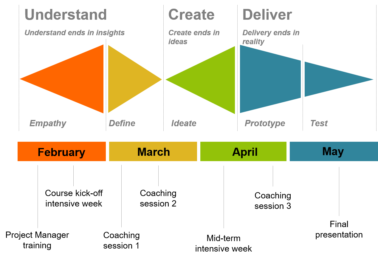 Weekly Team-Work: Outside of the two intensive weeks (kick-off week and mid-term intensive week) teams carry out independent teamwork, based on the project plan prepared in the kick-off week and advice provided by the coach. For the preparation of the project plan, each team is given instructions and guidance during the kick-off week. This plan is reviewed and adapted in the coaching sessions, together with the coach.